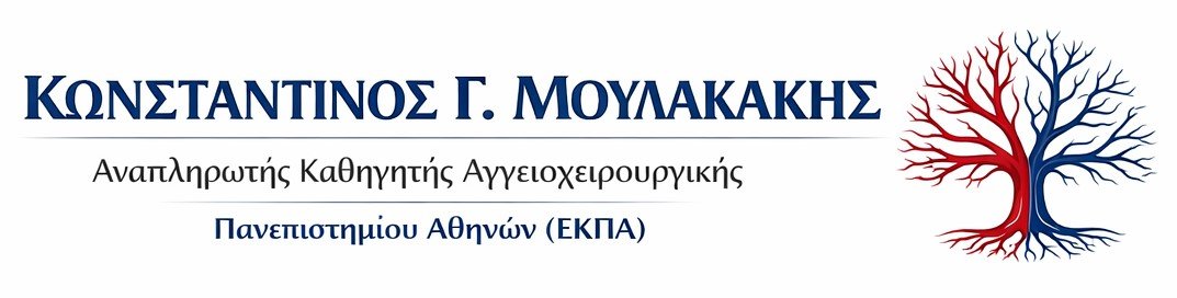 Ο κ. Κωνσταντίνος Γ. Μουλακάκης διαθέτει εκτεταμένο και διεθνώς αναγνωρισμένο ερευνητικό έργο στον χώρο της Αγγειοχειρουργικής. Με περισσότερες από 200 δημοσιεύσεις καταγεγραμμένες στο PUBMED, έχει συμβάλει σημαντικά στην πρόοδο της αγγειοχειρουργικής γνώσης, συμμετέχοντας σε πολυάριθμες πολυκεντρικές μελέτες, τυχαιοποιημένες κλινικές δοκιμές και διεθνή ερευνητικά δίκτυα. Παράλληλα, δρα ως κριτής και μέλος συντακτικών επιτροπών σε κορυφαία διεθνή επιστημονικά περιοδικά του κλάδου.